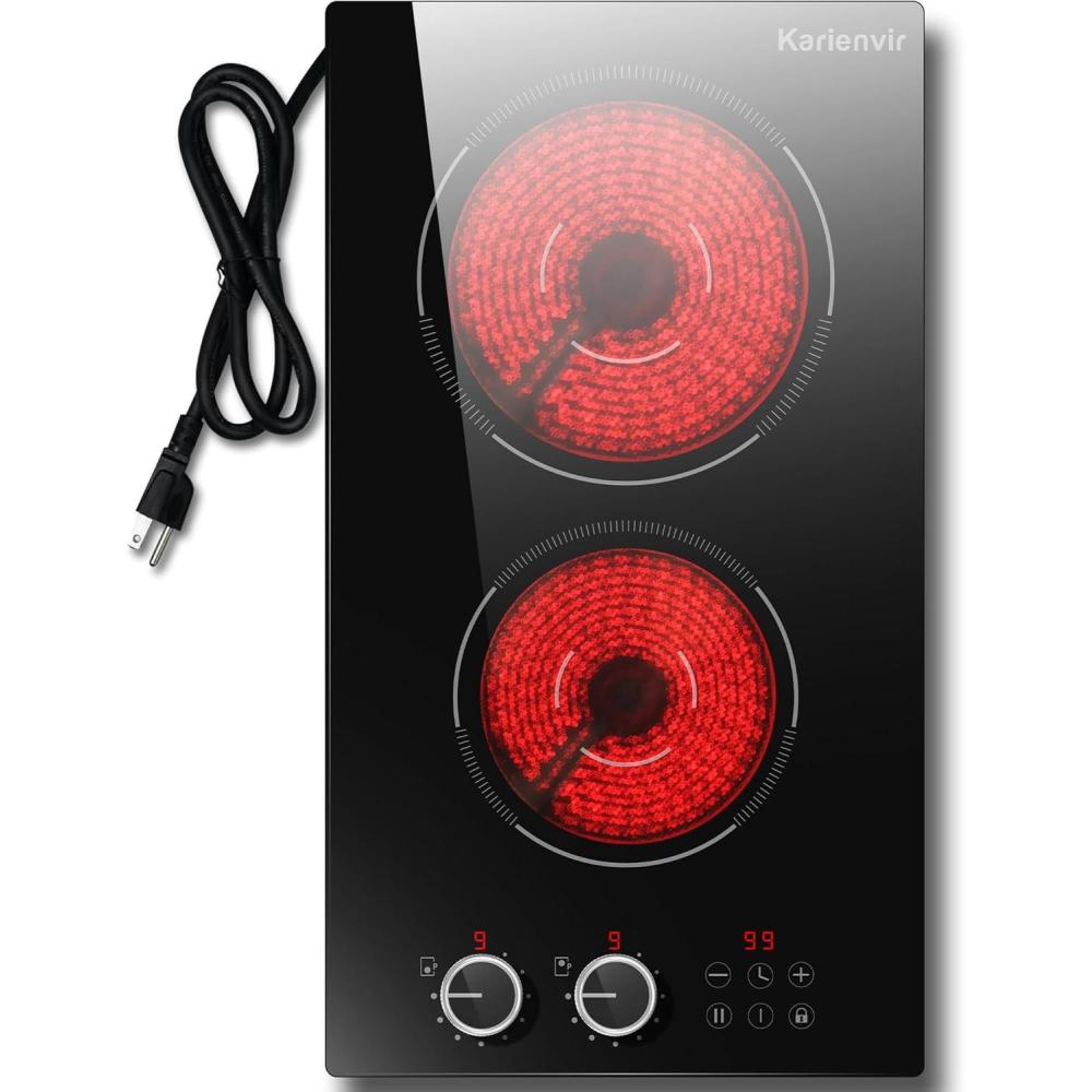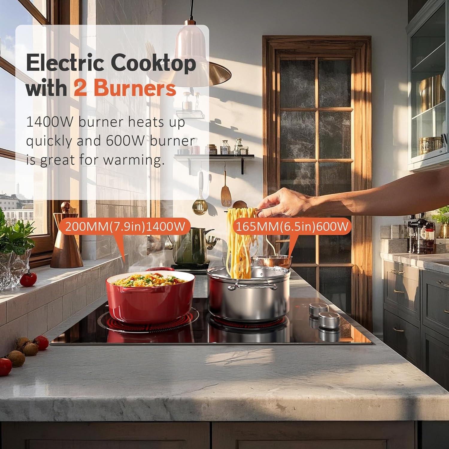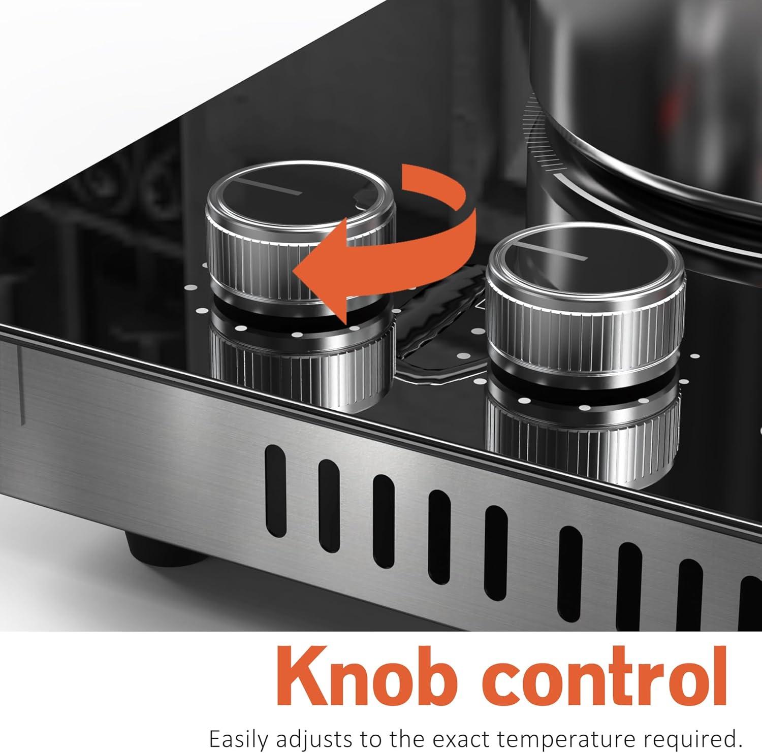 【Dual Control (Anti-Slip Knob + Touch Panel) for Precision】Each burner has an anti-slip textured knob (9 power levels, LED display) for easy heat adjustment. The touch panel adds 99-min timer (press “+”/”-” to set, auto-shutoff), child safety lock (3s hold to unlock), and dual-ring control. This electric stove top lets you simmer oatmeal or sear meats with accuracy—perfect for beginner and pro cooks alike.