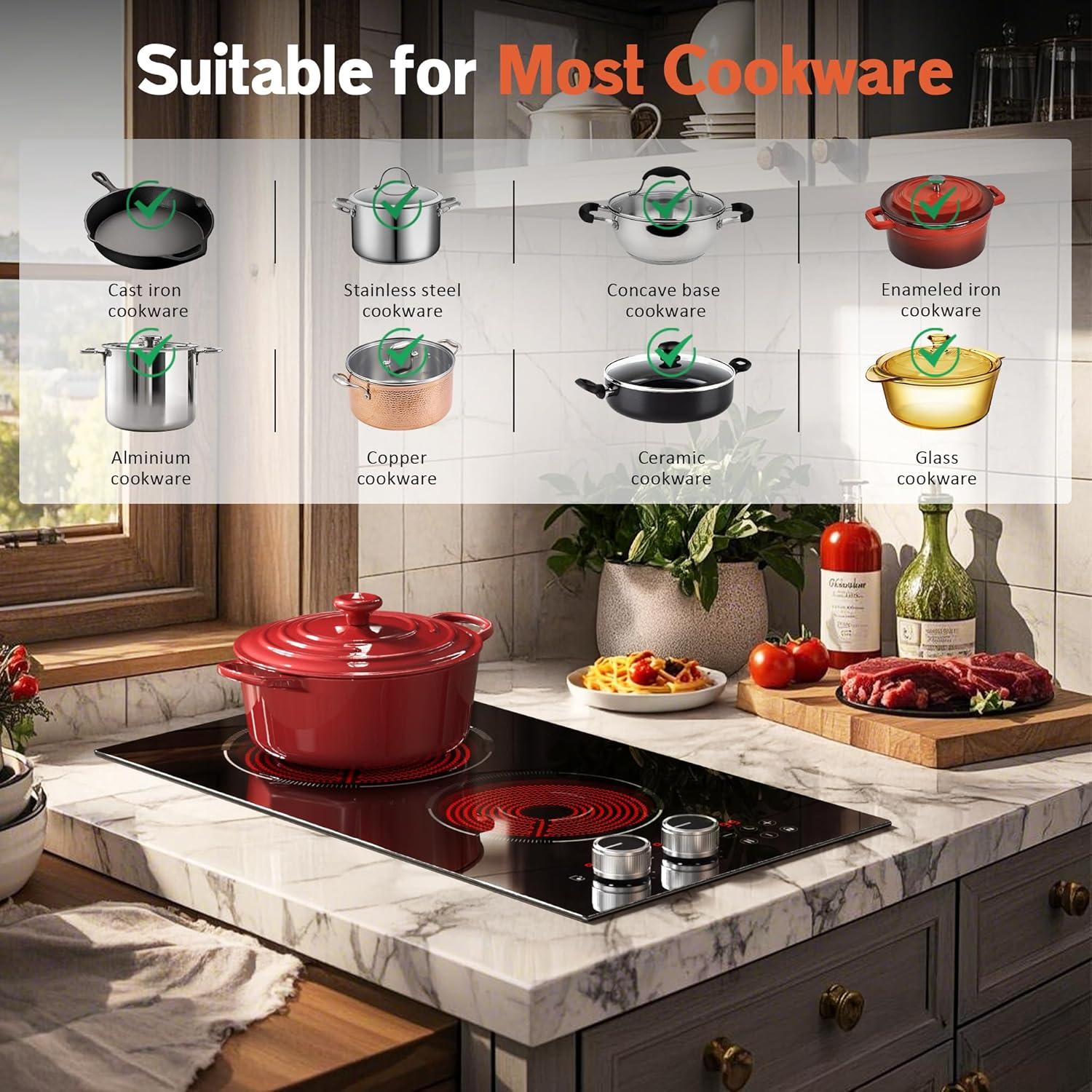 【Universal Pot Compatibility & Energy Efficiency】This 30 inch electric stove top works with all cookware (stainless steel, cast iron, ceramic, glass)—no need for new pots! Dual-ring burners save energy by matching power to pot size (small pans use inner ring, large pots use dual ring). This cooktop 30 inch fits daily cooking needs, combining practicality and efficiency in one stylish appliance.